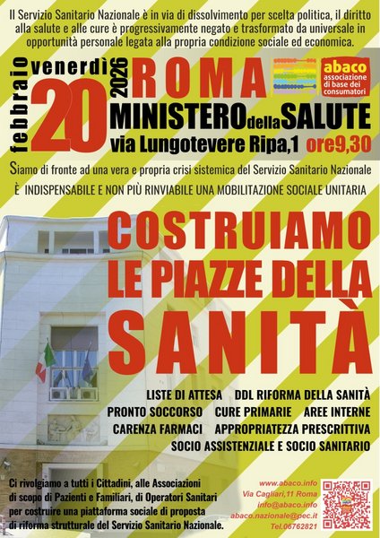 Il giorno 20 Febbraio 2026, la USB PENSIONATI sarà con ABACO al MINISTERO DELLA SALUTE per parlare della SANITÀ in tutti i suoi aspetti attuali e dei futuri assetti. Sarà una giornata di lotta per difendere la SANITÀ PUBBLICA. La USB PENSIONATI non si lascerà sfuggire l'occasione per riproporre la necessità ormai indispensabile, e non più rinviabile, di un "CONTRATTO SOCIALE" per tutelare chi dopo una vita di lavoro, nel momento maggiore del bisogno che riguarda la propria salute, è costretto ad affrontare problematiche insopportabili a causa di affaristi e speculatori privati che invece di svolgere un sano compito sussidario alla SANITÀ PUBBLICA, vogliono impradonirsene per farne solo profitto depredando risorse e mortificando la dignità e i diritti delle persone.