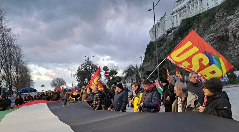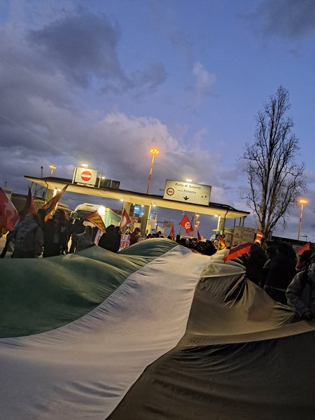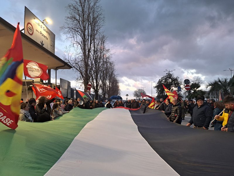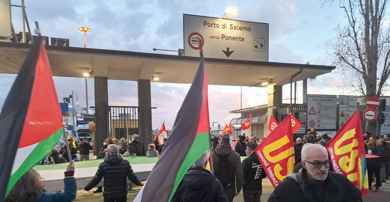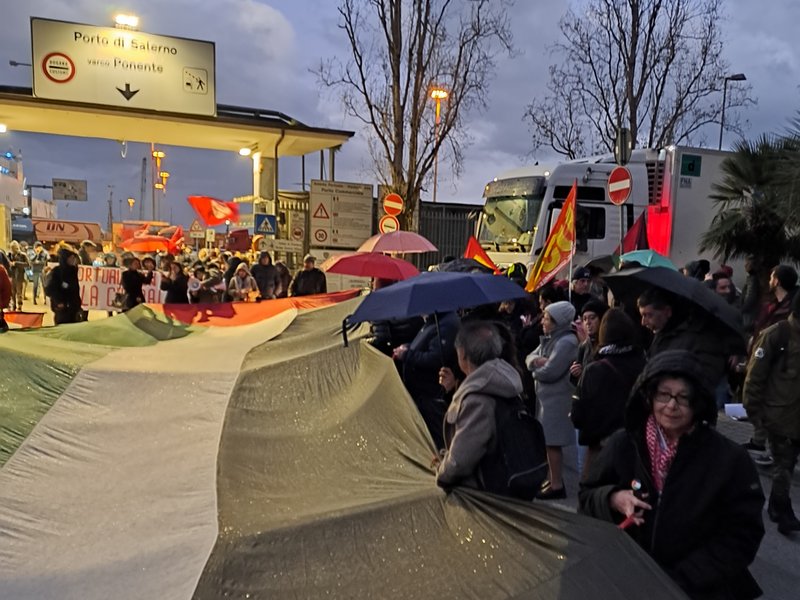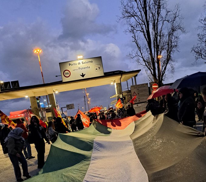 Un’immagine potente di questa determinazione viene da Salerno. Qui, un presidio tenace di attivisti e studenti, con docenti e lavoratori di altri comparti, ha bloccato, anche sotto la pioggia, fino a sera, l’accesso al porto, stendendo come barriera un’enorme bandiera palestinese. Quel blocco non era una protesta simbolica: era un atto preciso di lotta. Un rifiuto operativo a fare del porto un hub per il traffico di armi e una contestazione netta a un modello di sviluppo che sacrifica la sovranità collettiva e i beni comuni agli interessi privati.